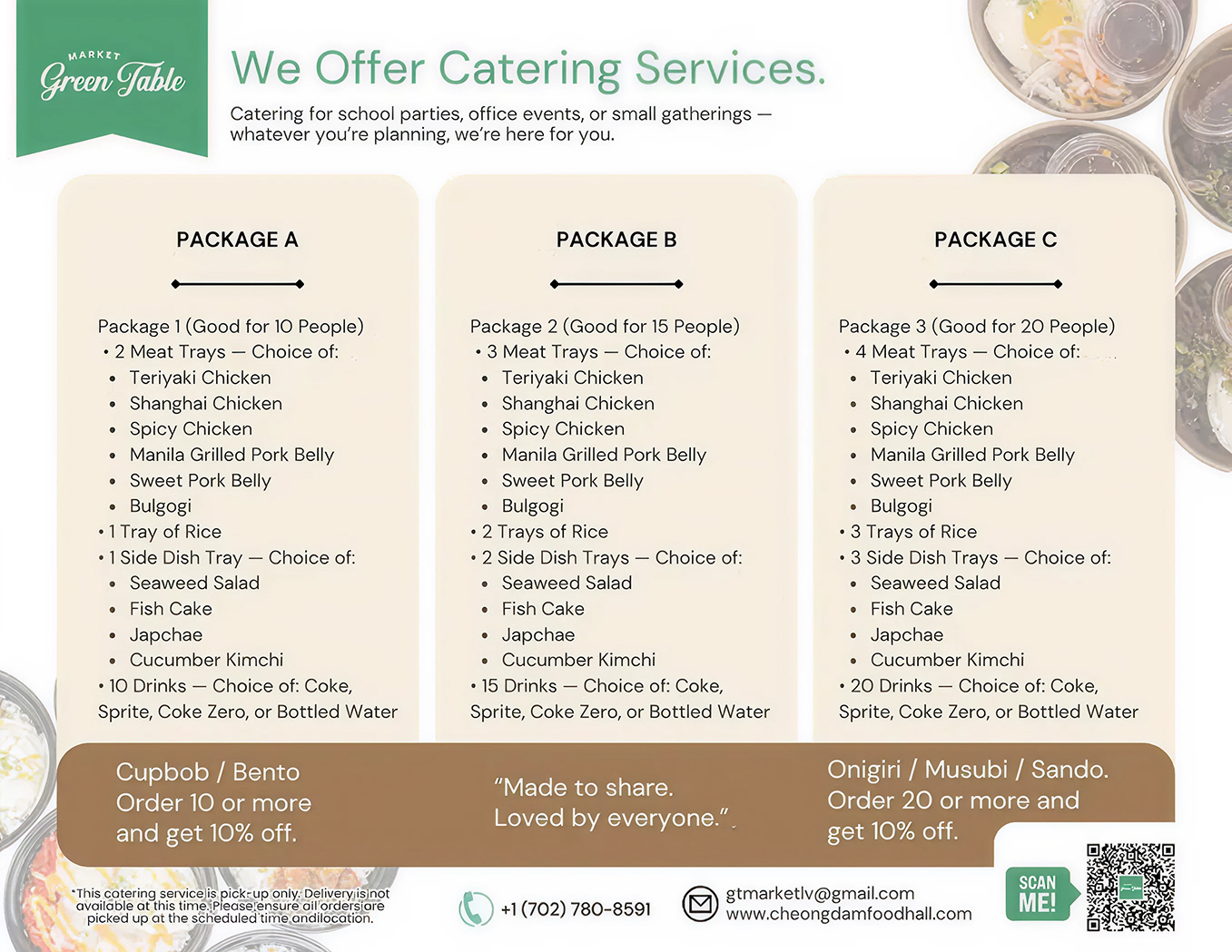 Market Green Table is a cornerstone of the Cheongdam Food Hall, the first local Asian food hall in Las Vegas. Our mission is to bridge the gap between fast-paced living and nutritious eating by providing high-quality, authentic Asian grab-and-go options. We pride ourselves on freshness and variety, ensuring every guest finds a satisfying meal that fits their schedule. We are committed to serving the local community with convenience, quality, and a taste of home.